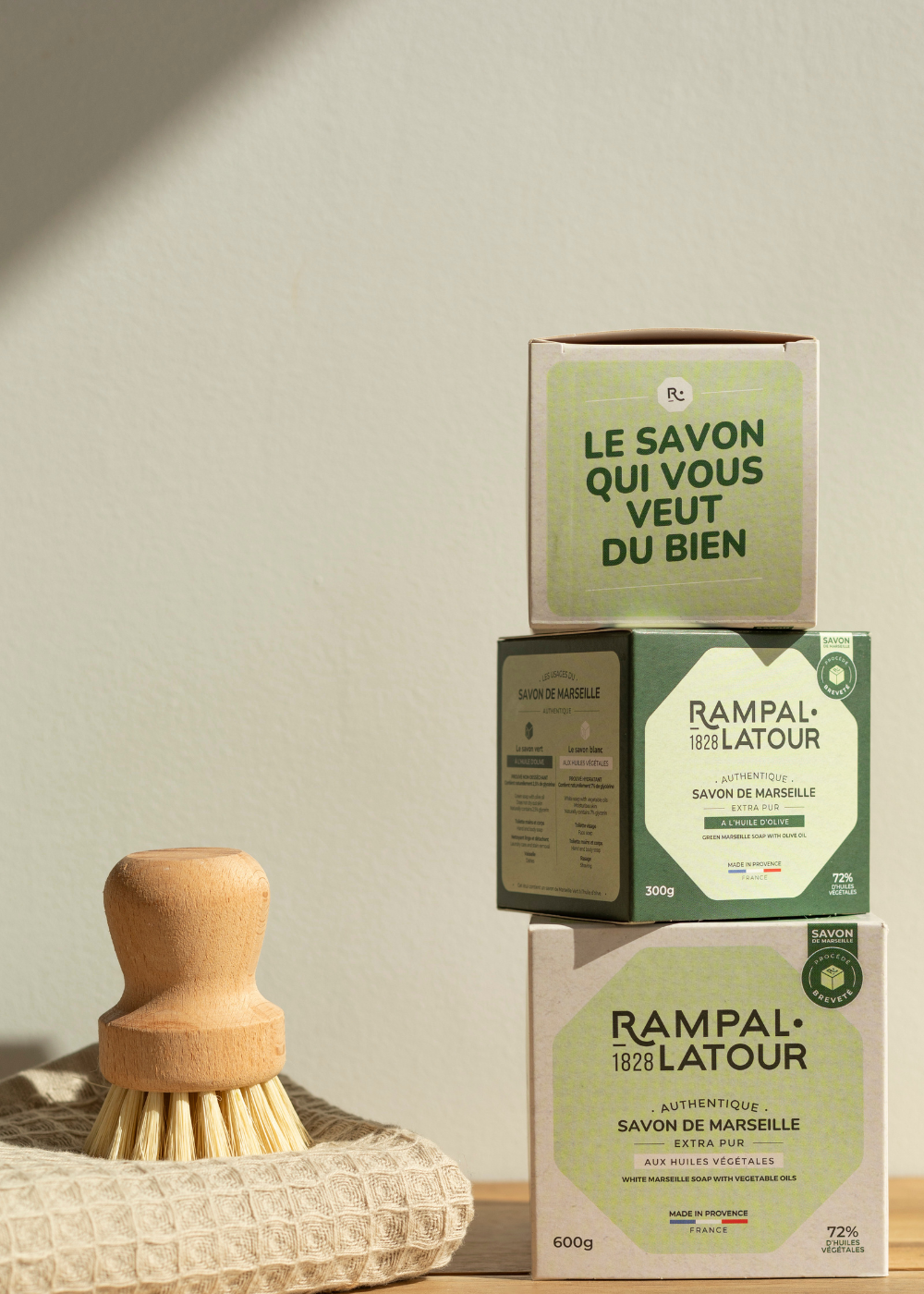 Depuis 1828, Rampal Latour détient le savoir-faire de la fabrication du vrai savon de Marseille. Notre savon de Marseille à l'huile d'olive ou blanc est cuit dans nos chaudrons à Salon de Provence, dans le respect du procédé traditionnel et authentique « Marseillais ». Soucieux d’améliorer la qualité de notre savon et l’empreinte écologique de notre savonnerie, nous avons développé, après 3 années de recherche et 2 dépôts de brevet, une technique de fabrication améliorée, permettant d’utiliser 4 fois moins d’eau et 7 fois moins d’énergie pour sa fabrication. En outre, ce procédé breveté permet d’améliorer les vertus hydratantes et protectrices de notre savon de Marseille, grâce à la glycérine naturelle qu'il conserve désormais au cours de la saponification. Une exclusivité Rampal Latour. Et tout ça, tout en gardant notre mode de fabrication artisanal.